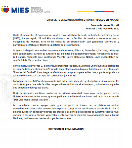 28 MIL KITS DE ALIMENTACIÓN SE HAN ENTREGADO EN MANABÍ