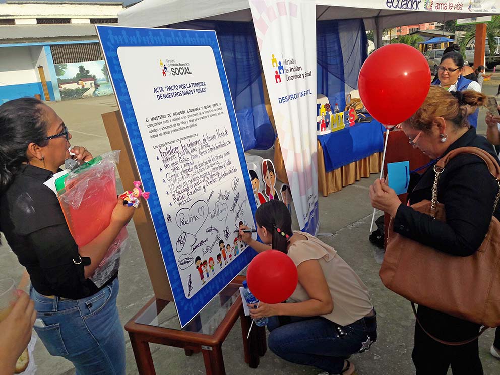 Con el objetivo de promover las buenas prácticas de crianza, cuidado y educación con buen trato de niñas y niños, alrededor de 300 madres y padres de familia, usuarios de los servicios de los Centros Infantiles del Buen Vivir (CIBV) y las unidades Creciendo con Nuestros Hijos (CNH) de los cantones Santa Rosa, Arenillas, Huaquillas y Las Lajas firmaron este viernes un “Pacto por la ternura”.