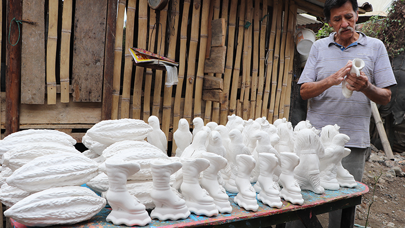 La jornada laboral de este emprendedor inicia a las 5 de la mañana. Durante el día, junto a su esposa e hijos elaboran más de 60 figuras de yeso que sirven de adornos, llaveros o alcancías. Estos productos son comercializados en ferias o entregados bajo pedido. “A través del apoyo del Estado pude iniciar mi negocio. Ahora, me siento activo con este emprendimiento”, expresó Antonio.