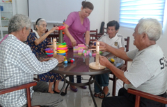 Lucila, una vez concluida su primera terapia, acude al taller de actividades lúdica –en un salón que está lleno de rompecabezas, legos, juegos de ensarte, pinzas, enhebrados, ensartado, encajes y más. Aquí en compañía de otros adultos mayores, realiza actividades de motricidad fina (coordinación ojo-mano). “Nos reímos todos cuando realizamos estos trabajos porque nos hace recordar nuestra infancia; pero lo hermoso es que nos vuelve activos y más ágiles”, comenta.