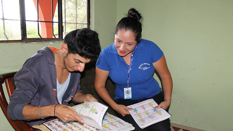 Beatriz Valverde es madre de Juan Diego Flores, un joven con discapacidad auditiva y verbal. Ella comentó que su hijo recibe la visita de los técnicos del MIES cada 15 días. Durante este encuentro, dijo que tanto ella como su hijo aprenden el lenguaje de señas, con el propósito de mejorar su comunicación, además de recibir consejos para mejorar el cuidado de su hijo.