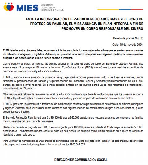 ANTE LA INCORPORACIÓN DE 550.000 BENEFICIADOS MÁS EN EL BONO DE PROTECCIÓN FAMILIAR, EL MIES ANUNCIA UN PLAN INTEGRAL A FIN DE PROMOVER UN COBRO RESPONSABLE DEL DINERO