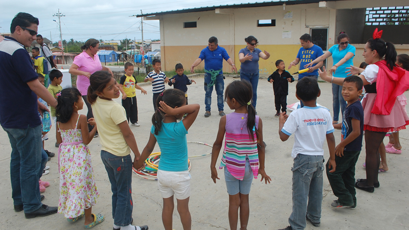 En primer lugar, cerca de 300 niñas y niños del sector participaron en un emotivo homenaje que se realizó en la Unidad Educativa Elías Cedeño. Después lo hizo con alrededor de 200 infantes que permanecen en el albergue junto a sus familias.