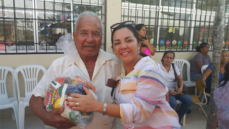 La Ministra de Inclusión Económica y Social, Lídice Larrea, realizó la entrega de 300 kits de alimentos en los sectores más afectados por el pasado terremoto de abril, la distribución se llevó a cabo en Chone la tarde de hoy, 22 de agosto, e la compañía de autoridades locales del MIES.