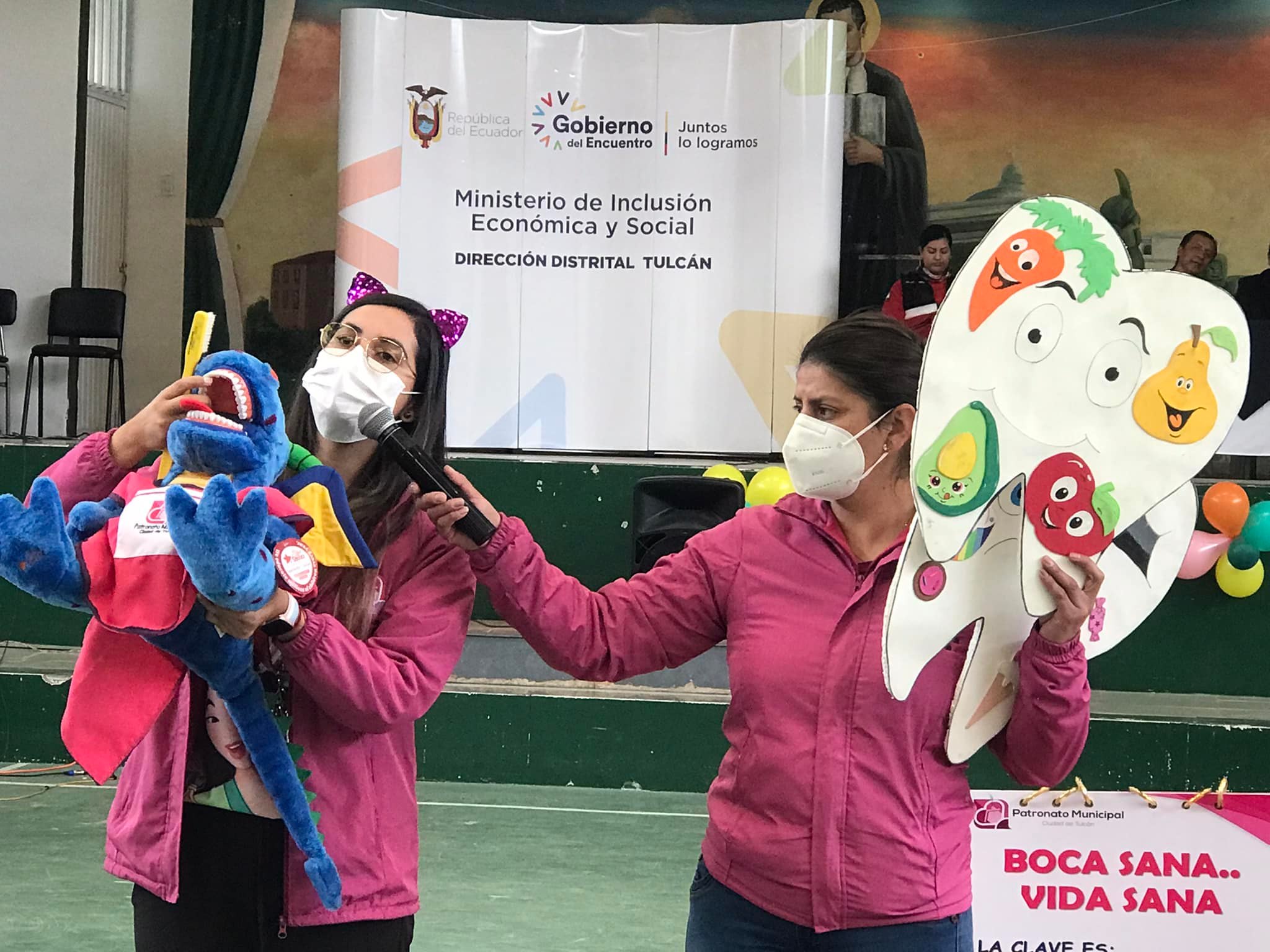 En Tulcán, el evento reunió a más de 200 familias que acceden a los servicios del MIES para niñas y niños, que contó con stands informativos de nutrición, lavado de manos, alimentación en periodo de lactancia, huertos familiares y pintucaritas. Además, de animación con títeres como aporte de los Bomberos de Tulcán y una charla de salud bucal, por parte del Patronato de Amparo Social del GAD de Tulcán.