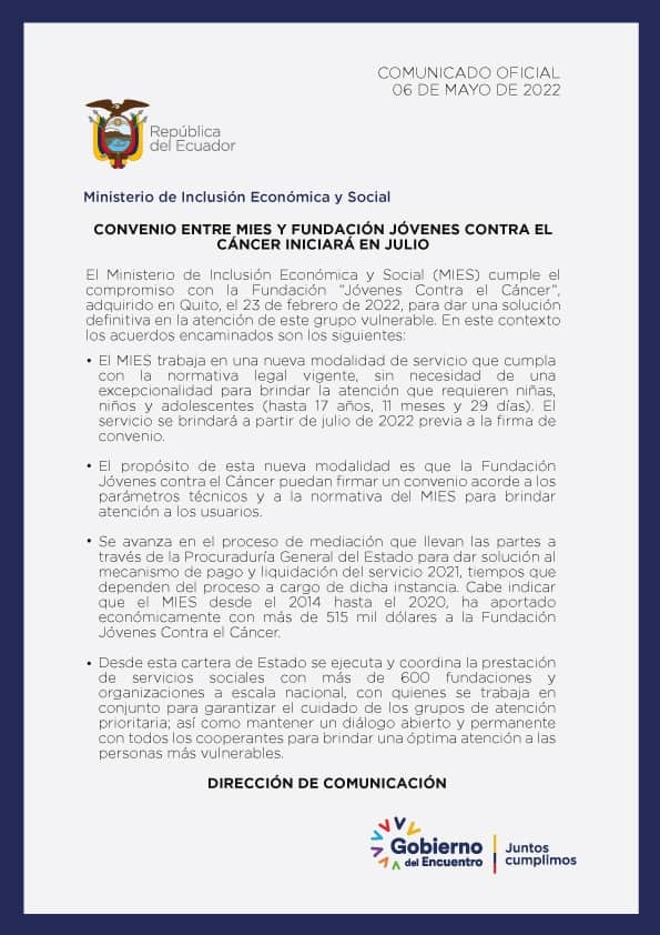 Convenio entre el MIES y Jóvenes Contra el Cáncer