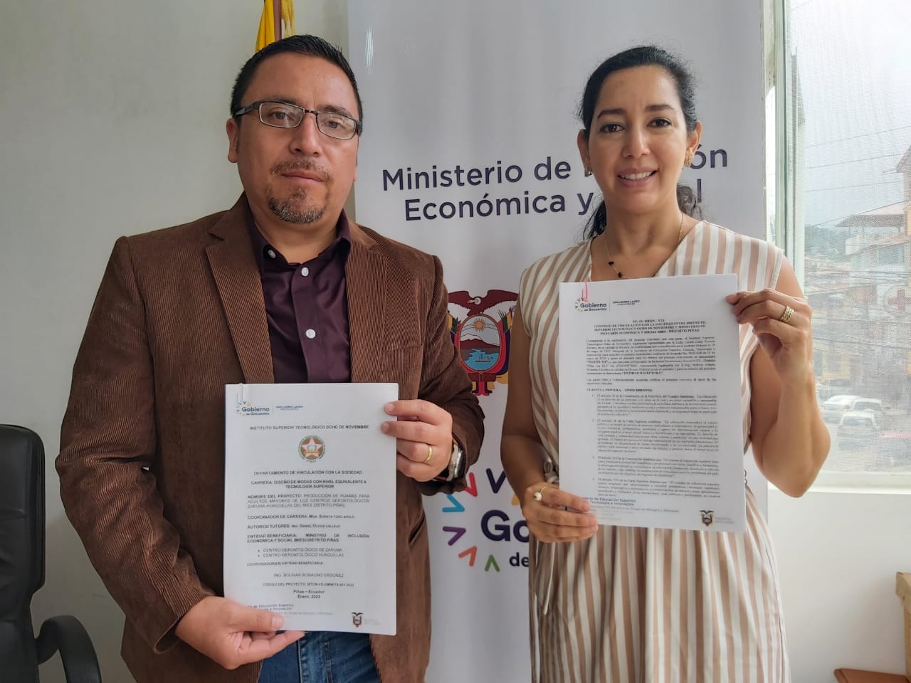La Dirección Distrital Piñas del Ministerio de Inclusión Económica y Social (MIES) y el Instituto Superior Tecnológico “Ocho de Noviembre” (ISTON) suscribieron un convenio de cooperación interinstitucional, con el objetivo de fortalecer los procesos de vinculación con la sociedad de los estudiantes de la carrera en Diseño de Modas, mediante la producción de prendas de vestir para los adultos mayores usuarios de los centros gerontológicos residenciales, administrados por esta cartera de Estado.