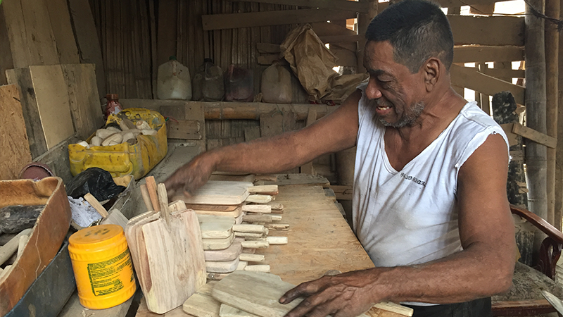 Con mucha motivación, Enrique Nieto de 71 años de edad, habitante de la Coop. Oramas González en el cantón Durán, usuario del Crédito de Desarrollo Humano (CDH) del Ministerio de Inclusión Económica y Social (MIES) elabora tablas de cangrejo, como una forma de sustento diario.