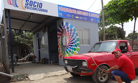 Mediante el programa “Socio Vulcanizador”, que lleva adelante el Instituto Nacional de Economía Popular y Solidaria (IEPS), pudo implementar un taller productivo y desmontable de 6 x 5 m, y el respectivo equipamiento con maquinaria automática para sacar e instalar neumáticos, palancas, pistolas de aire y compresor, con una inversión de 14 mil dólares.