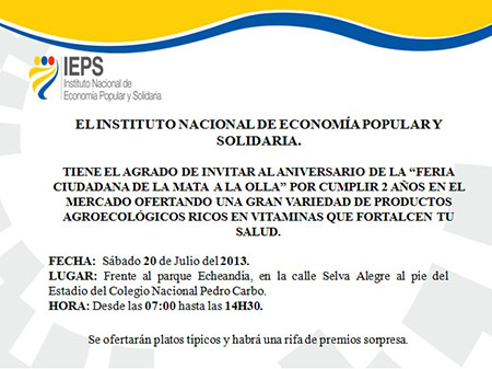 “De la Mata a la Olla”, la feria ciudadana promovida por el Ministerio de Inclusión Económica y Social (MIES) informa  que el día sábado, 20 de julio del 2013, desde las 07H00 hasta las 14H30, estará ofertando productos en los bajos del estadio del Colegio “Pedro Carbo” (frente al parque ‘Echeandía’).