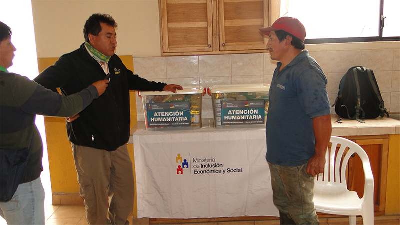 Dos familias acogidas en el albergue de Penipe, provincia de Chimborazo, ante la reactivación del volcán Tungurahua, recibieron atención humanitaria del Ministerio de Inclusión Económica y Social (MIES). Las personas afectadas recibieron este lunes, 29 de febrero, kits de alimentos no perecibles.
