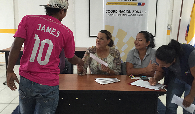 Diez familias damnificadas por el terremoto del 16 de abril, que hoy viven en Tena, recibieron por parte del MIES el dinero recaudado durante el evento “Una Mano Por Manabí y Esmeraldas”. La iniciativa que logró el aporte económico de miles de ciudadanos fue realizada por jóvenes voluntarios de la Dirección Distrital MIES Tena.