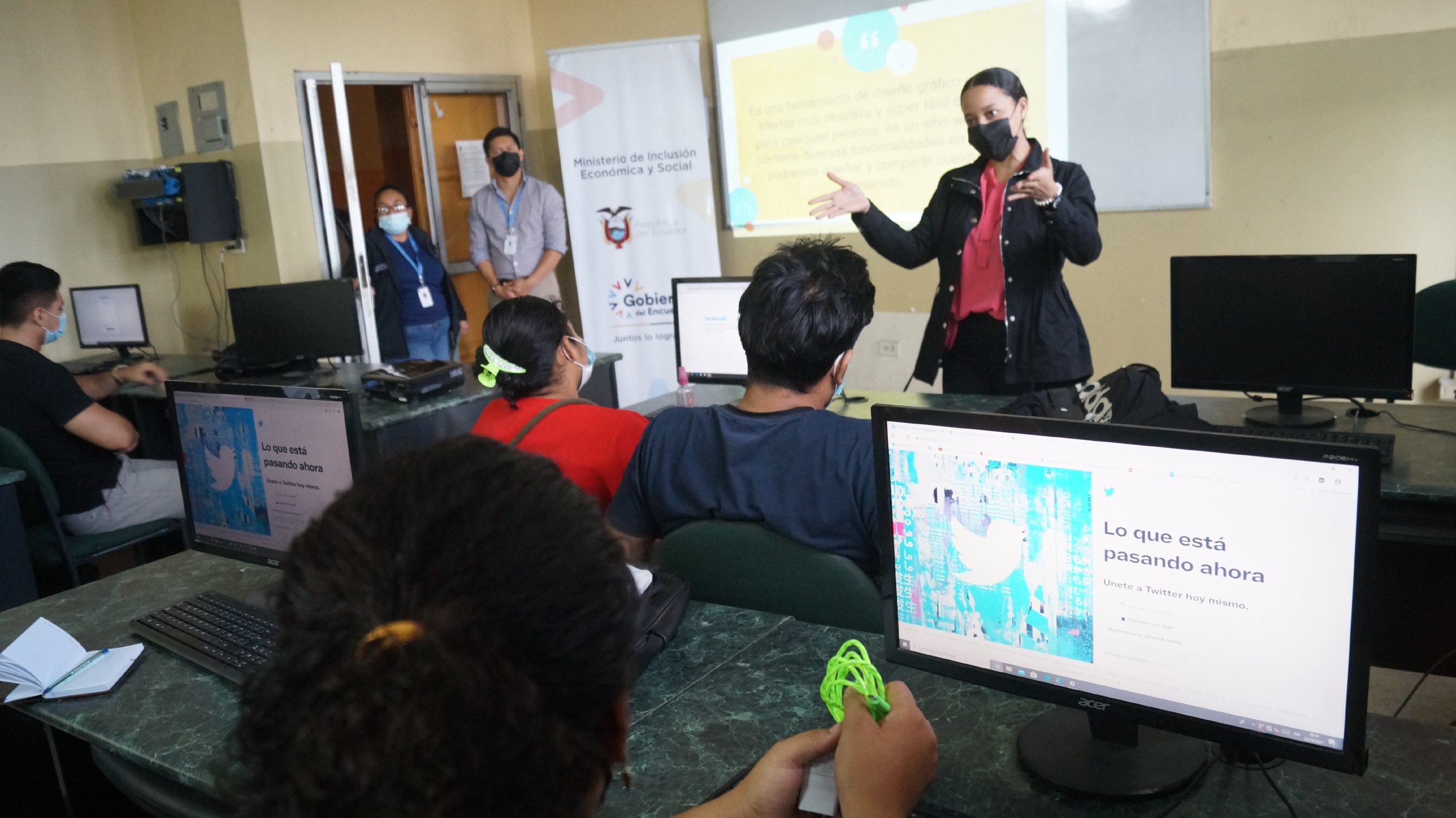 El primero de los talleres se realizó con el apoyo de estudiantes de la Facultad de Ingeniería Industrial de la Universidad de Guayaquil, como parte del proyecto de vinculación con la comunidad que mantiene el MIES con la entidad académica, en este caso específico se busca impulsar la venta de productos mediante las redes sociales.