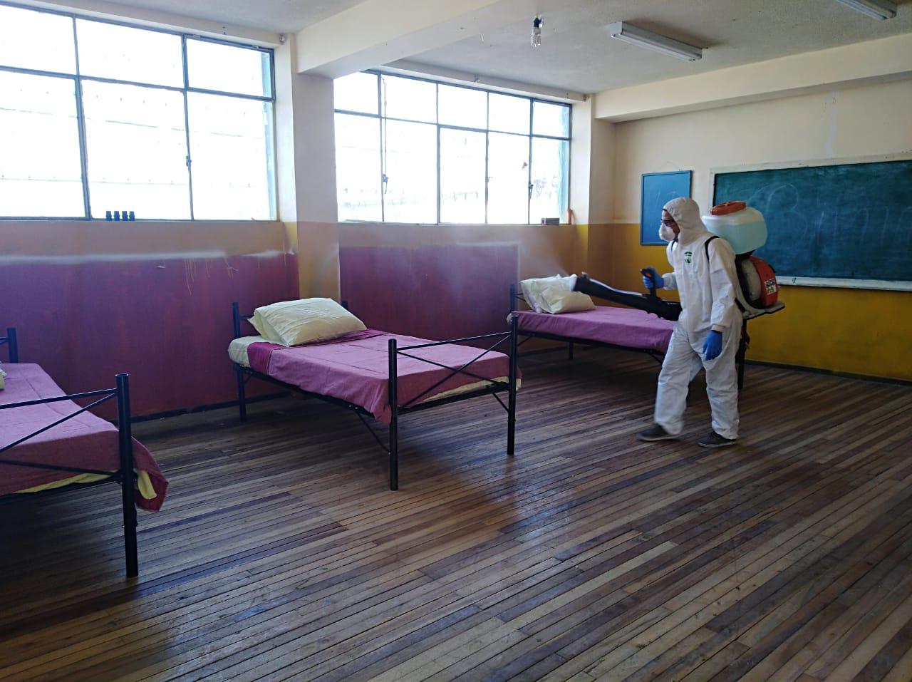 Previo a la apertura del albergue temporal, se cumplió con las medidas de limpieza y desinfección de las instalaciones.