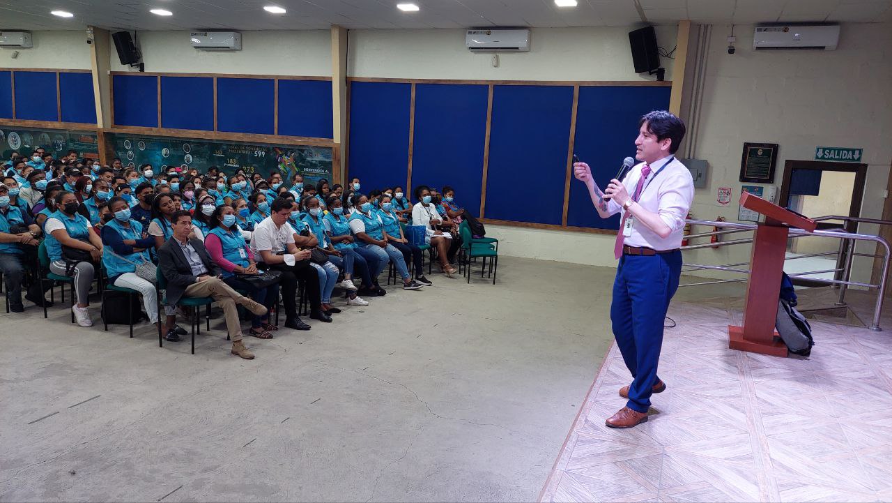 El subsecretario de Desarrollo Infantil Integral del Ministerio de Inclusión Económica y Social (MIES), Luis Mendizábal y el coordinador zonal 8 de esta misma cartera de Estado, Stiven Molina, mantuvieron un conversatorio sobre desnutrición crónica infantil, con 750 educadoras y educadores del servicio institucional Creciendo con Nuestros Hijos (CNH), quienes acudieron este viernes, 22 de julio, hasta las instalaciones del Instituto Superior Universitario Bolivariano (ITB), en el norte de Guayaquil.