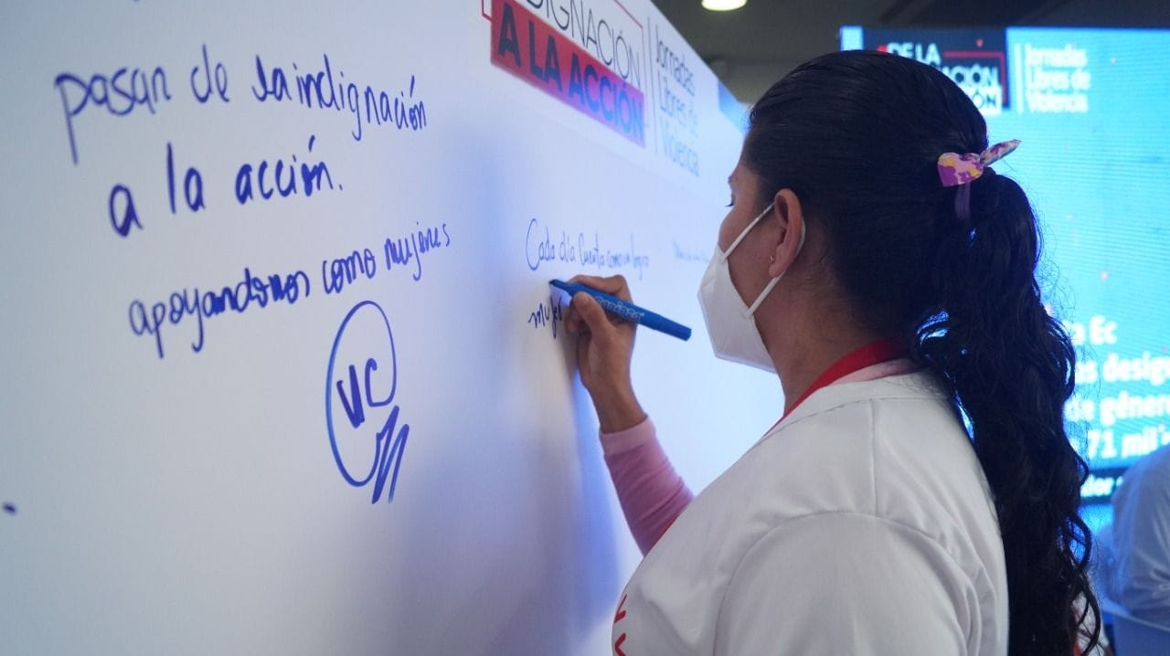 Adicionalmente, la Viceministra del MIES, junto con otras autoridades de esta misma entidad y mujeres emprendedoras firmaron un compromiso bajo el lema “De la indignación a la acción, jornadas libres de violencia”, para respaldar las políticas que promueve el Gobierno Nacional como el Decreto Ejecutivo N° 268 mediante el cual se declara de prioridad nacional la promoción y defensa de igualdad de género.