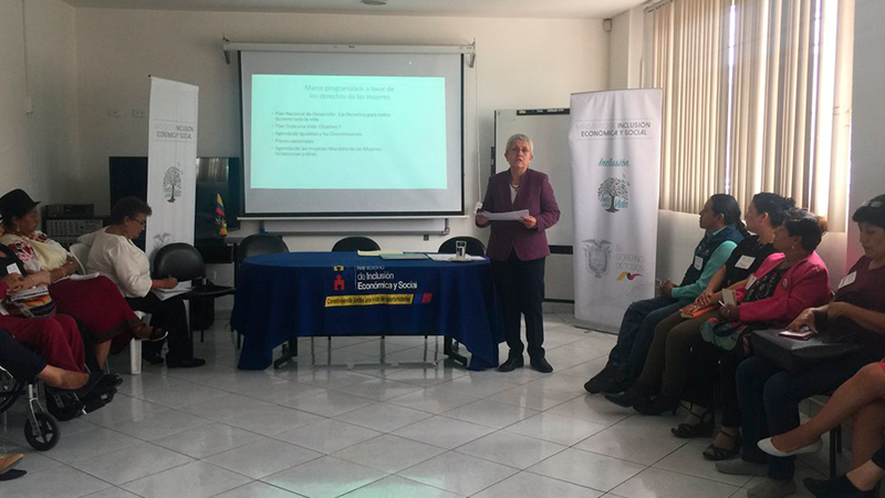 En el marco del programa “Misión Mujeres”, Rocío Rosero, ministra subrogante del Ministerio de Inclusión Económica y Social MIES socializó a 48 representantes de organizaciones de mujeres de la provincia de Imbabura la política pública que se busca establecer a nivel nacional para erradicar la violencia de las mujeres, niñas y adolescentes.