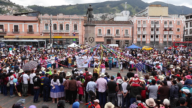 Con una colorida fiesta, que incluyó presentaciones artísticas, celebraciones y rituales ancestrales, música y bailes, alrededor de 1.500 mil personas participaron en la “toma simbólica” de la Plaza de Santo Domingo, centro de Quito, que realizó el Ministerio de Inclusión Económica y Social (MIES) como parte de la campaña contra la violencia denominada “Ni una y ni un guagua menos”, que lleva adelante el Gobierno Nacional.