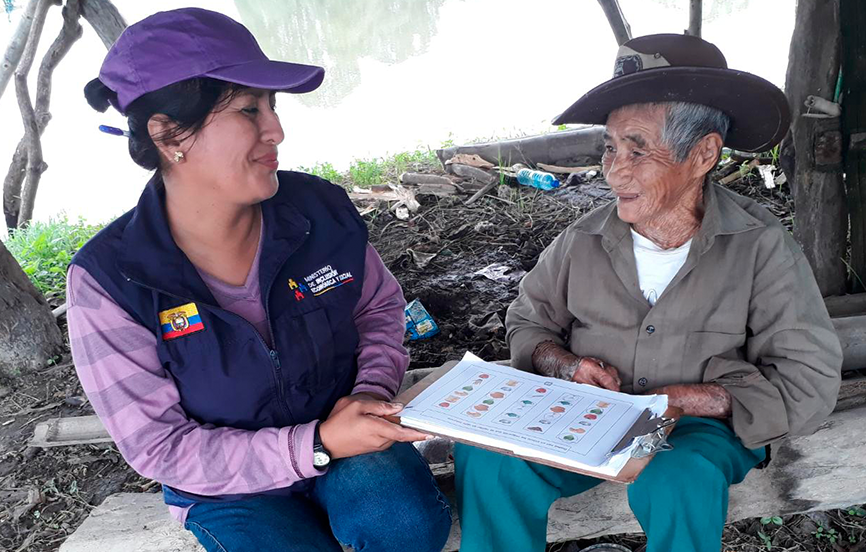 Con una amplia sonrisa Ramón Mindiola, adulto mayor de 72 años, habitante del recinto El Chorrón del cantón Samborondón, recibe en su vivienda a la tutora Cristina Rivera de la Misión Mis Mejores Años. Este programa del Ministerio de Inclusión Económica y Social (MIES) buscar mejorar la calidad de vida de adultos y adultas mayores con su intervención.