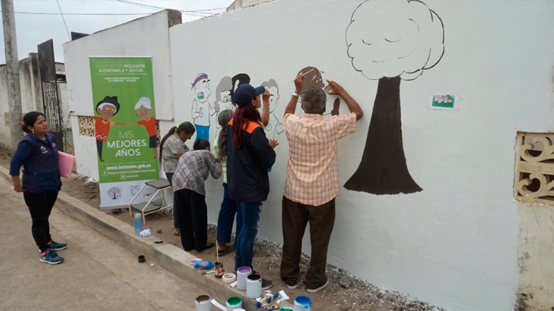 Alrededor de 200 personas adultas mayores participaron simultáneamente en la pintura del mural denominado “Pinta Mis Mejores Años”. La actividad la realizó el Ministerio de Inclusión Económica y Social (MIES) en coordinación con el gobierno y un club deportivo quien facilitó un espacio de una pared del Estadio 11 ubicado en la avenida Eleodoro Solórzano, vía principal del Cantón La Libertad, para plasmar mensajes en reconocimiento de los derechos de las personas adultas mayores, como parte de la conmemoración de su Día Internacional cada 1 de octubre.