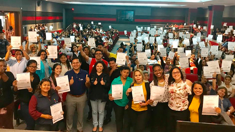 El Ministerio de Inclusión Económica y Social (MIES) entregó certificados a 450 técnicos de los programas de inclusión social como reconocimiento al trabajo desarrollado durante los cinco módulos programados mediante la estrategia institucional Escuela de Familias “Protejamos toda una vida sin violencia”, que contaron con la participación de los usuarios y usuarias de desarrollo infantil, discapacidad, adultos mayores y protección especial del norte de Guayaquil.