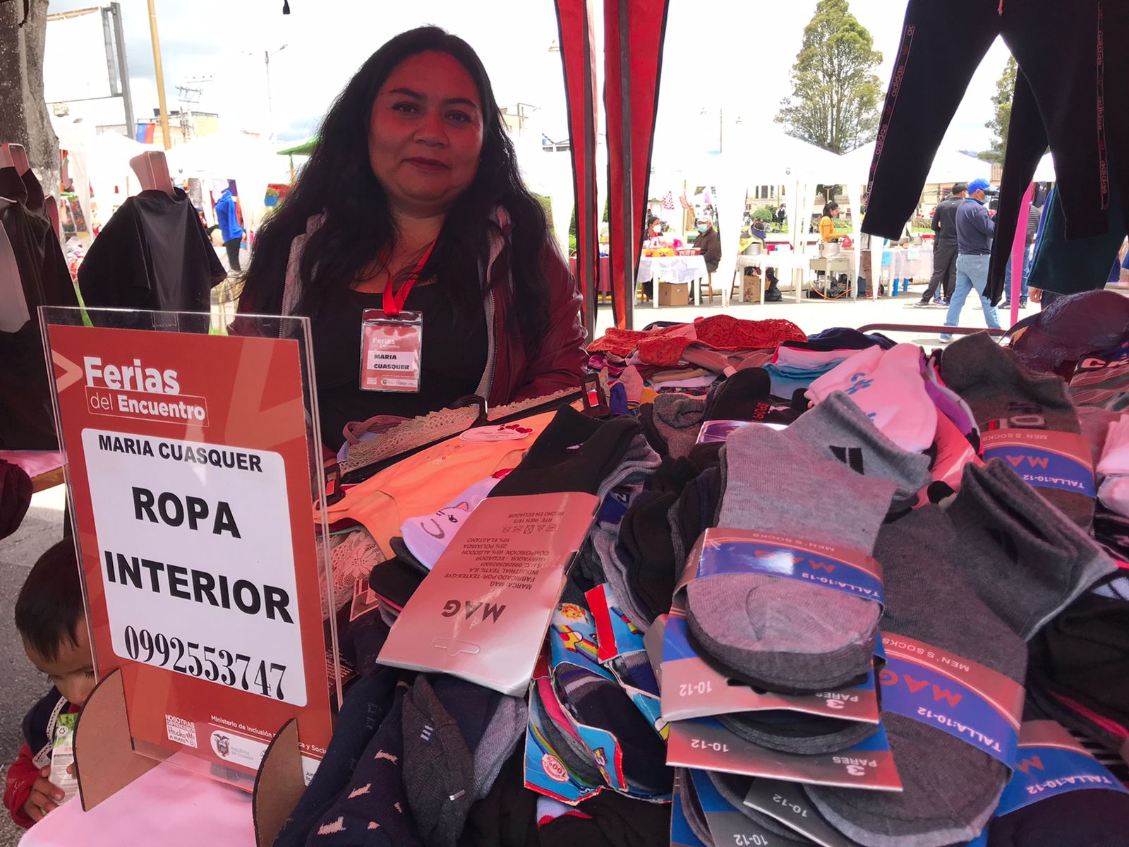 María Cuasquer, usuaria del Crédito de Desarrollo Humano, de Tulcán, vende ropa interior con apoyo de su hija, para ella la feria le permitió ampliar su cartera de clientes “La feria nos dio contactos para seguir vendiendo”, dijo la emprendedora.