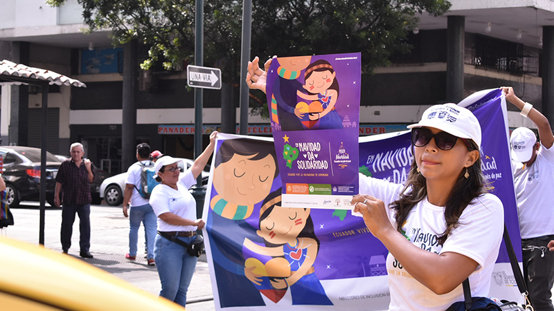 La campaña “En Navidad da Solidaridad” se continúa difundiendo en espacios públicos de Guayaquil, para prevenir y sensibilizar a la ciudadanía sobre los riesgos de la mendicidad y que expone a niños, niñas, adolescentes, adultos mayores y personas con discapacidad a esta práctica. Con ese objetivo este martes 17 de diciembre se desarrolló una concentración de unos 300 participantes convocados por el Ministerio de Inclusión Económica y Social (MIES), quienes llegaron hasta los exteriores del parque Centenario, en el centro de la ciudad.