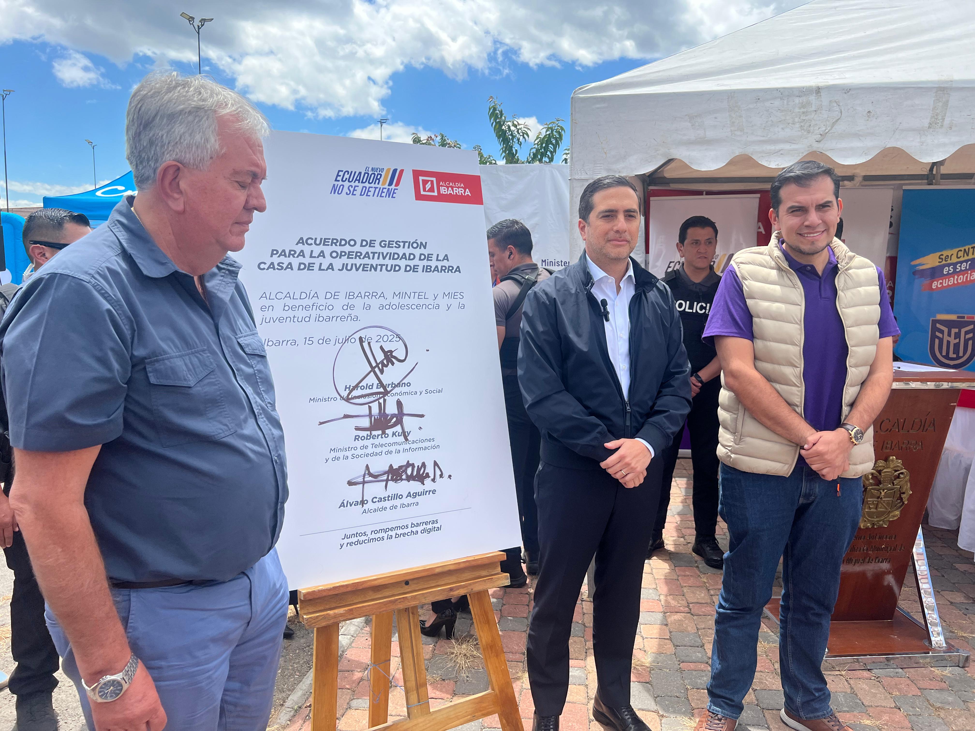 Durante la inauguración, el ministro del MIES, Harold Burbano, destacó que, para el Gobierno Nacional, Imbabura y las provincias del norte del país, tienen alta prioridad en el desarrollo de proyectos sociales por su potencial y por los conflictos sociales que demandan nuevos retos de atención como es la movilidad humana, la interrelación intercultural y plurinacionalidad en sus territorios. Precisamente, hoy se entrega este servicio gracias al MINTEL y a la articulación de la alcaldía con el gobierno central, donde la tecnología nos dará nuevas oportunidades de capacitación, acceso a nuevos recursos para la juventud imbabureña y para convertirse en ventanas hacia el desarrollo, dijo.
