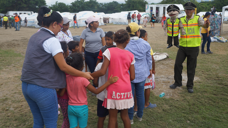 En la ciudad de Pedernales, una de las más afectadas por el terremoto, se encuentran activados cuatro albergues, Ricardo Laz, gestor de uno de ellos comentó: “Las actividades con los niños tienen una respuesta positiva. Quieren aprender y participar en todo lo que realizamos”, señaló durante una presentación que realizó la Policía Nacional y Paquito.