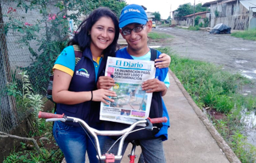 Ahora, Richard, con su gran sonrisa y junto a una bicicleta, que fue donada por el representante de la comunidad Santa María, se encarga de la distribución de periódicos y recorre las casas de varios habitantes del sitio Santa María, logrando de esta manera mantener a los ciudadanos informados.