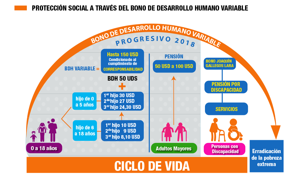 Un total de 74 mil núcleos familiares, que actualmente reciben el Bono de Desarrollo Humano (BDH) de 50 dólares mensuales, recibirán el Bono Variable. Esta transferencia económica está destinada a las familias en situación de extrema pobreza y vulnerabilidad, usuarios del BDH y que tienen hijos menores de 18 años.