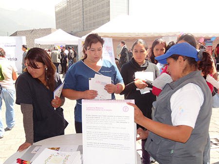 Este jueves, 08 de agosto de 2013, en los exteriores del Hospital de Especialidades Eugenio Espejo, la Coordinación Zonal 9 del MIES, participó con un stand informativo del Programa Creciendo con Nuestros Hijos CNH. Las técnicas del MIES ofrecieron una charla a las madres de familia en la cual les explicaron la forma adecuada de ejercer la lactancia materna y la alimentación infantil. Además de esto, se realizó la entrega del libro “Cultura de Crianza” el mismo que es producto de una ardua investigación por parte de los funcionarios del MIES y que se entrega en los Centros Infantiles del Buen Vivir con el objetivo de cultivar en las madres de familia buenos hábitos de crianza y alimentación en la infancia.
