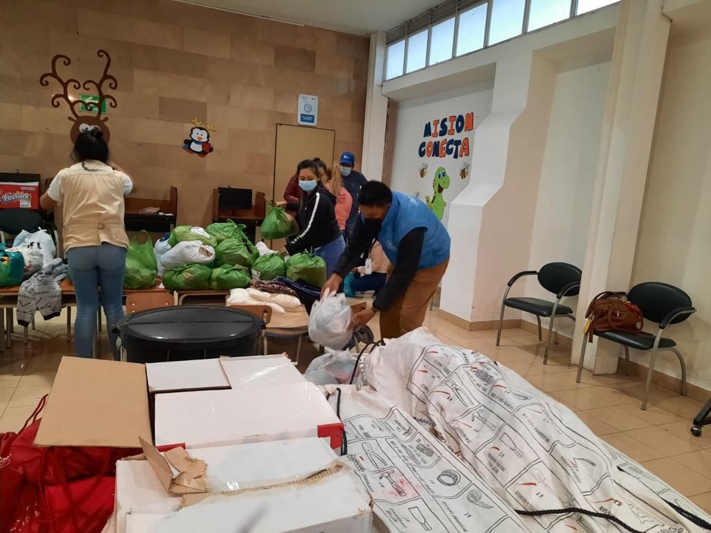Equipos técnicos del MIES prepararon kits con alimentos y ropa para entregar a las familias afectadas por las inundaciones debido a los desbordamientos de ríos en el cantón Rumiñahui.