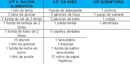 El albergue cuenta con colchones, bidones de agua, cocinas industriales, cobijas botiquines de emergencia, víveres y demás insumos necesarios para atender a las familias albergadas. De igual manera  cada familia recibió por parte del MIES kits de alimento, aseo y dormitorio.