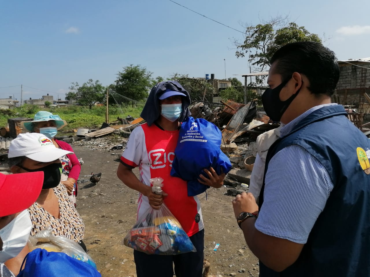 Personal del Ministerio de Inclusión Económica y Social (MIES) se hizo presente este lunes 1 de febrero en el sector Dos Hermanos del cantón Durán, para entregar kits de alimentos y ropa, para una familia de siete integrantes que resultó damnificada por un incendio que consumió la vivienda donde habitaba, así como sus enseres y pertenencias.