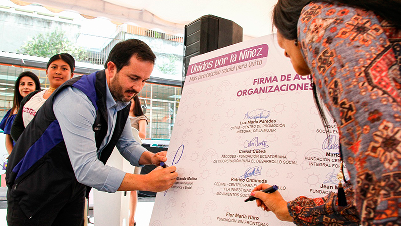 El Gobierno Nacional, a través del Ministro de Inclusión Económica y Social (MIES), firmó 15 nuevos acuerdos de cooperación con organizaciones sociales para garantizar que 2.800 niñas y niños del sur, centro y norte de Quito reciban atención y cuidados en 58 Centros de Desarrollo Infantil (CDI).