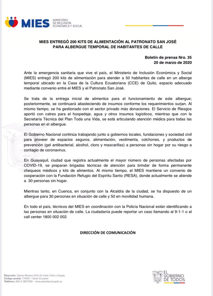 MIES ENTREGÓ 200 KITS DE ALIMENTACIÓN AL PATRONATO SAN JOSÉ PARA ALBERGUE TEMPORAL DE HABITANTES DE CALLE