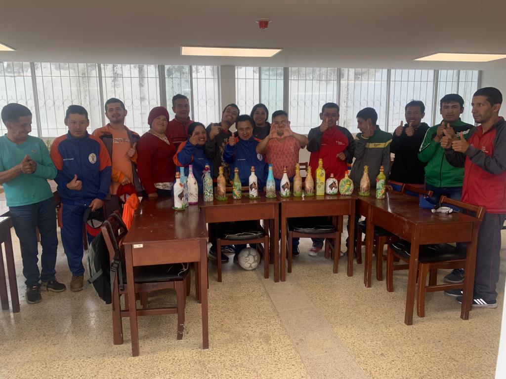 Con el propósito de generar emprendimientos familiares y fomentar la autonomía económica de personas con discapacidad, usuarios del Centro Diurno de Desarrollo Integral del Ministerio de Inclusión Económica y Social (MIES) en Loja, recibieron un taller de manualidades, donde aprendieron a decorar botellas recicladas.