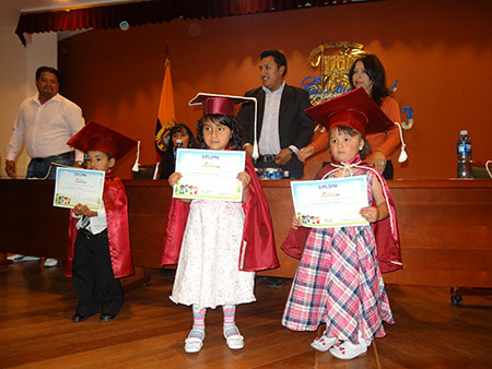 Aproximadamente 80 niñas y niños de los diferentes centros urbanos del programa Creciendo con Nuestros Hijos (CNH), del Ministerio de Inclusión Económica y Social (MIES), lucieron su capa, birrete y diploma esta mañana, en el “salón de la Ciudad” al culminar con éxito el primer tramo de su carrera educativa, enorgulleciendo a la numerosa asistencia de padres, madres, hermanos y otros familiares que acudieron al acto de graduación.