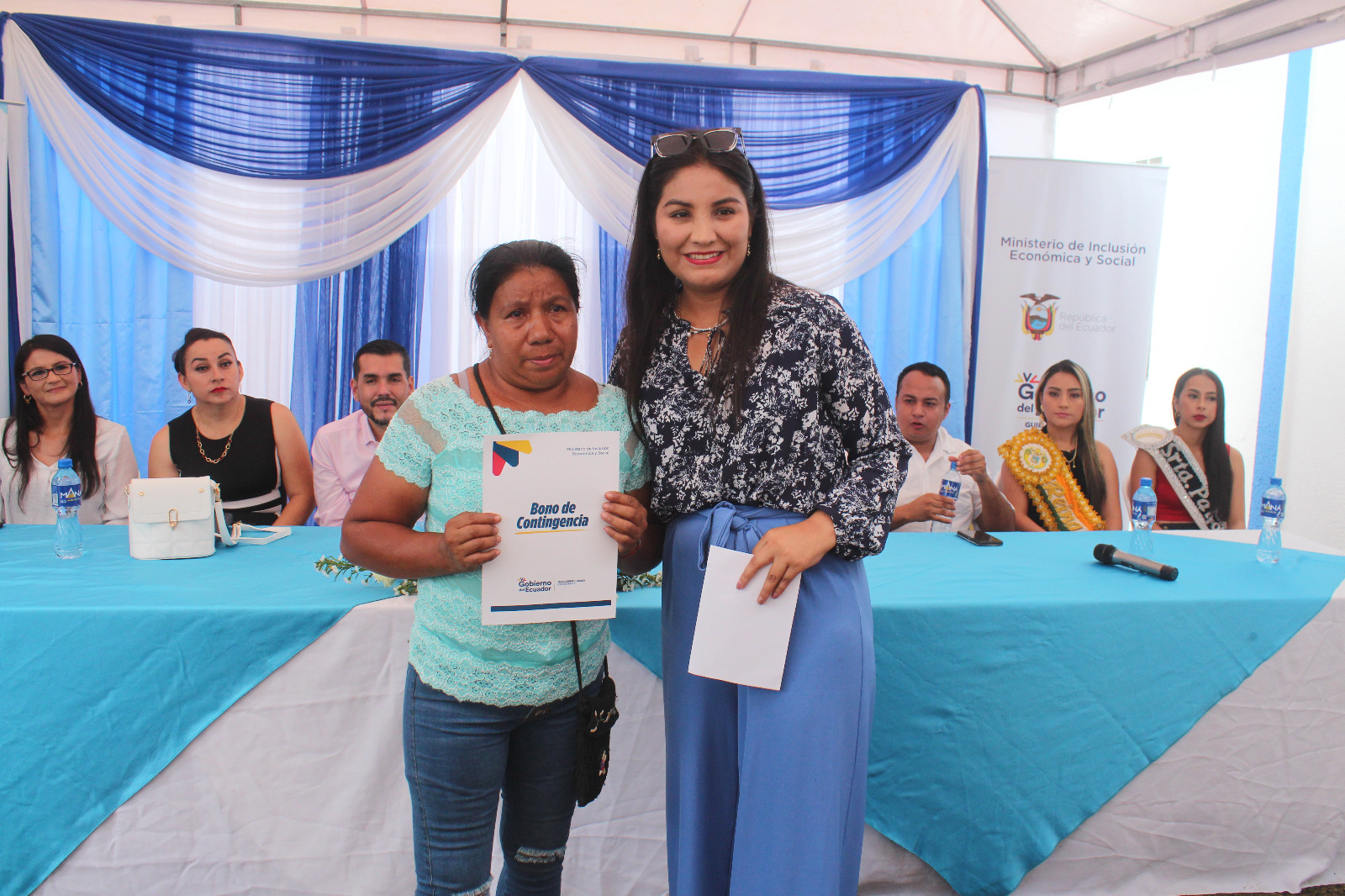 El valor del Bono de Contingencia para personas afectadas por evento de origen natural o antrópico es de 270 dólares, lo que representa la mitad de una Canasta Básica Vital. En el evento de inauguración y entrega del Bono de Contingencia estuvo presente la Gobernadora de la provincia, Tania Vásquez.