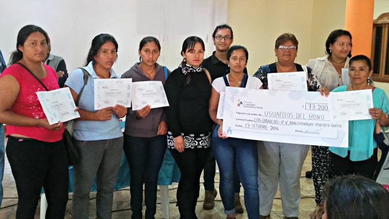 El Ministerio de Inclusión Económica y Social (MIES) realizó la entrega simbólica de 61 Créditos de Desarrollo Humano (CDH) por un valor de total de 73.200 dólares a mujeres beneficiarias del Bono de Desarrollo Humano (BDH), provenientes de San Miguel de los Bancos, Pedro Vicente Maldonado y Puerto Quito. El capital semilla será destinado a emprendimientos de: producción de cacao, crianza de pollos, cerdos y producción de leche.