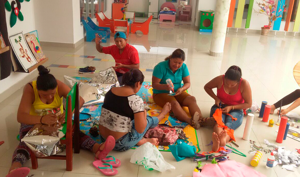El Ministerio de Inclusión Económica y Social (MIES) en Tena junto a 60 padres y madres de familia quienes tienen niñas y niños usuarios de los Centros Infantiles del Buen Vivir (CIBV) en la localidad elaboran material lúdico y didáctico basados en el reciclaje para estimular el crecimiento y desarrollo de los infantes.