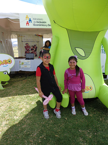 El sol alumbró el día. Un inflable grande de Tino, uno de lo personajes de la franja infantil de televisión “Veo veo”, llamó la atención de niñas y niños, quienes identificados con el programa se acercaron al stand del MIES. La mayoría había visto Veo veo, una producción de Ecuador Tv en co-producción con el MIES, que se transmite de lunes a domingo desde las 6:00.