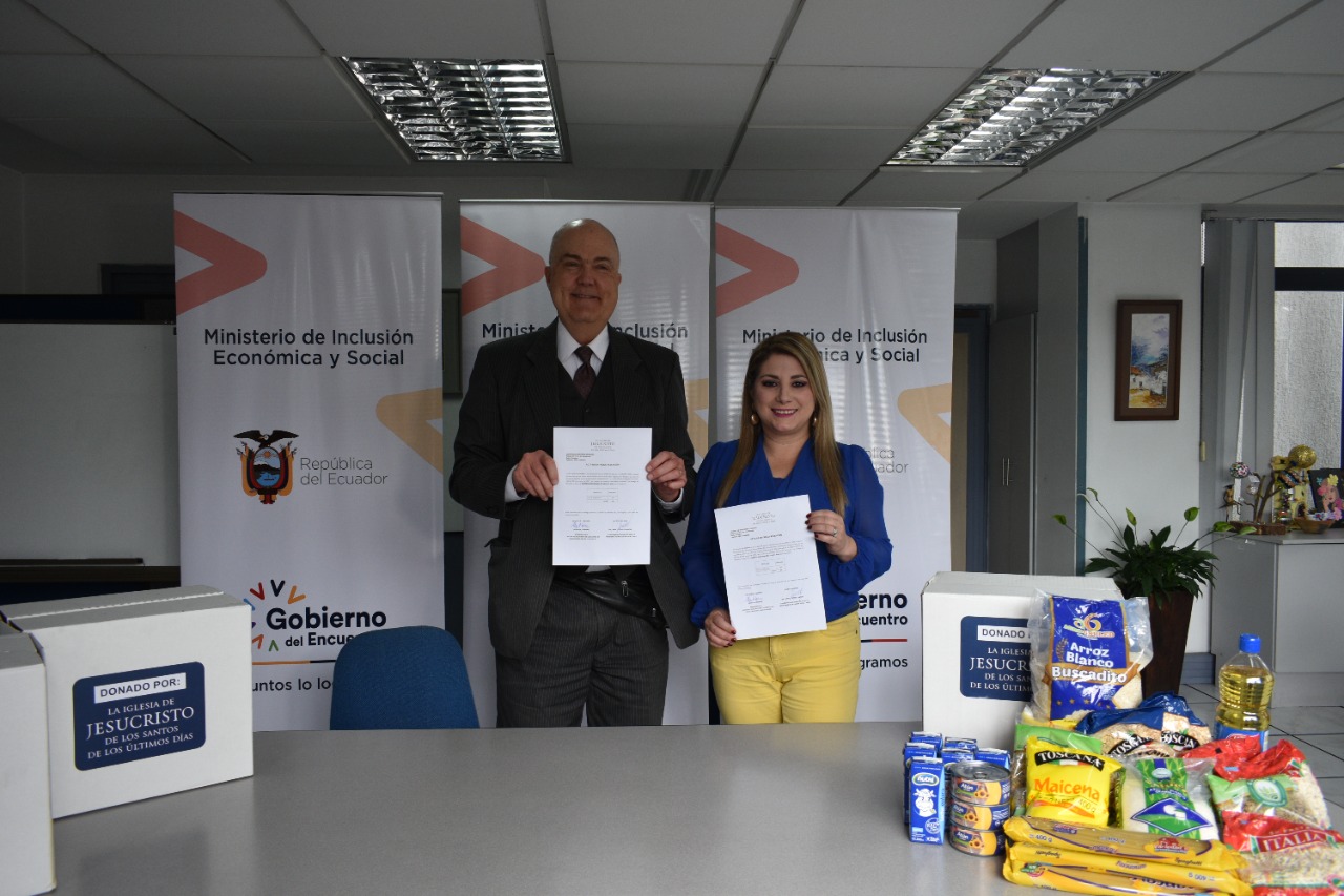 Un total de 200 kits de alimentos no perecibles recibió este jueves 19 de mayo la coordinadora zonal 6 del Ministerio de Inclusión Económica y Social, MIES, Nancy Torres, producto de la donación de la Iglesia Jesucristo de los Santos de los Últimos Días, los que serán entregados a los grupos de atención prioritaria y a las familias que fueron damnificadas en los últimos desastres naturales en la zona.