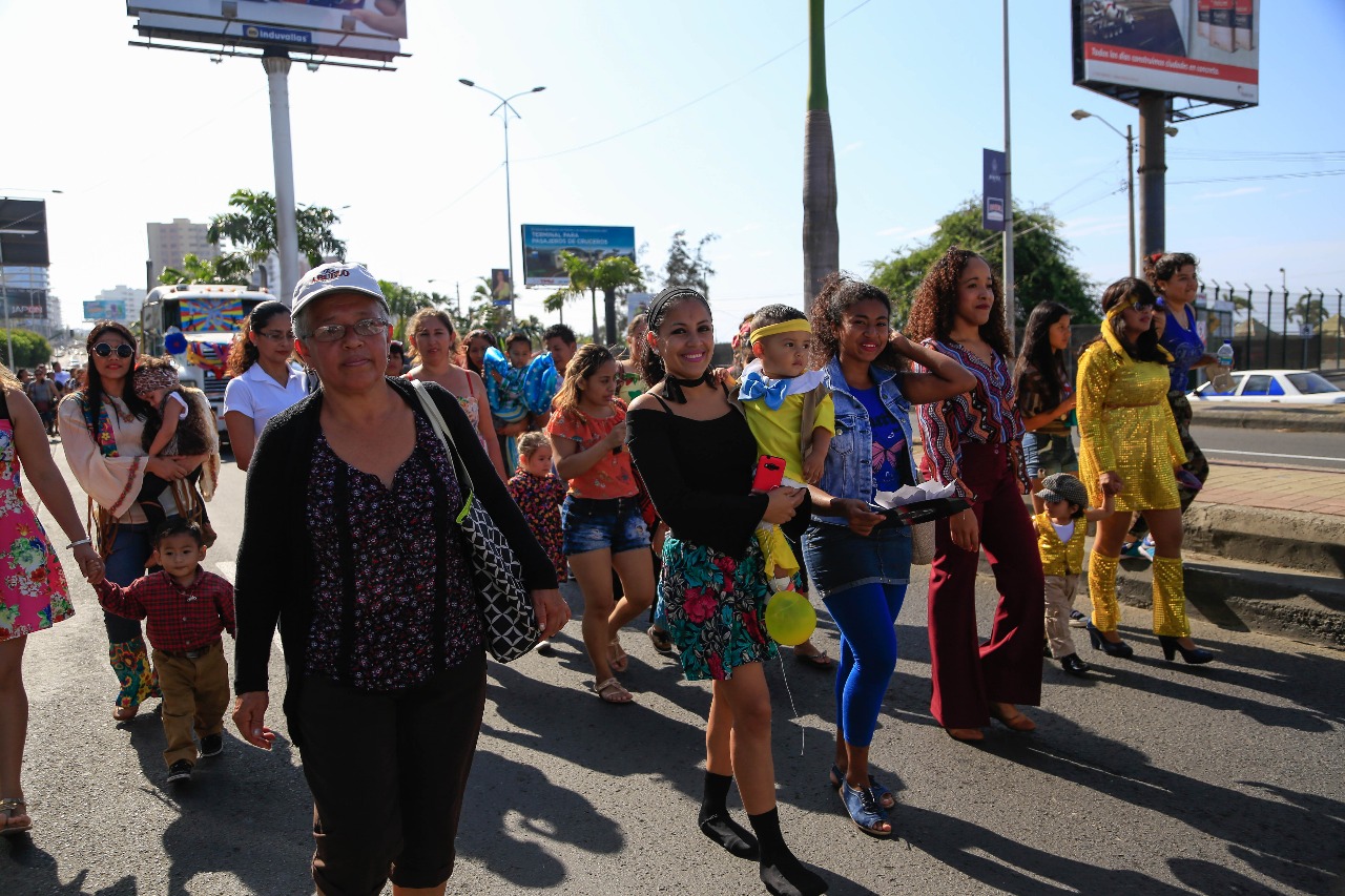 Carros alegóricos, zanqueros y coloridas comparsas, que contaron con la participaron niñas, niños junto a sus padres y madres de familias, fueron parte del pregón que culminó su recorrido en el Parque de la Armada, donde se desarrolló un programa artístico y cultural.