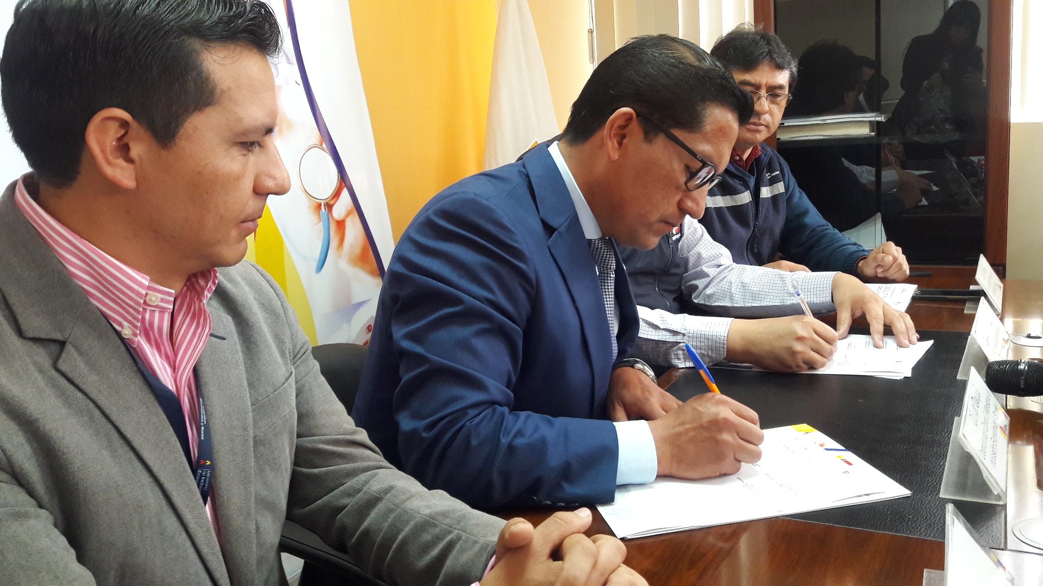 El coordinador del MIES Zona 3, César Daqui, firma el convenio que beneficiará con atención médica a 445 adultos mayores de Guano.