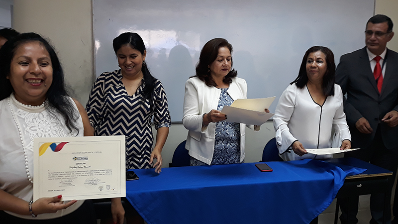 Para este propósito, el MIES coordinó desde el pasado 19 de noviembre del 2018 hasta el 18 de enero del 2109, la capacitación de Fortalecimiento Administrativo y de Gestión dirigido a los emprendedores CDH y servicios del MIES, en el marco de las Escuelas de Inclusión Económica que culminaron hoy su proceso de formación del primer grupo de participantes.