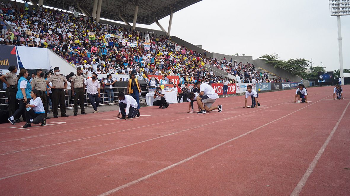 Este 12 de junio, Día Mundial Contra el Trabajo Infantil, alrededor de 4 mil personas de los diferentes programas y servicios del Ministerio de Inclusión Económica y Social (MIES), se reunieron en el estadio Cristian “Chucho” Benítez, del parque Samanes, para participar y presenciar una carrera atlética de postas, protagonizada por niñas, niños, adolescentes y sus familias con el objetivo de concienciar a la ciudadanía sobre la importancia de erradicar el trabajo infantil.
