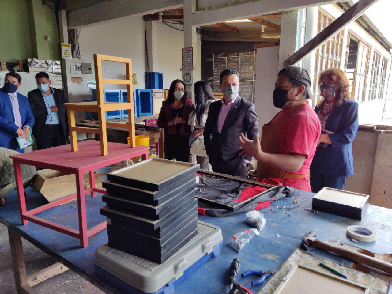 El ministro Bernal, en compañía de Margarita Carranco, subdirectora Nacional de Género del Consejo de la Judicatura, y autoridades de la Subsecretaría de Protección Especial del MIES, recorrió las instalaciones de este centro de atención y conoció sobre las actividades que cumplen adolescentes y jóvenes, quienes también reciben talleres de panadería, pastelería, carpintería, corte y confección.