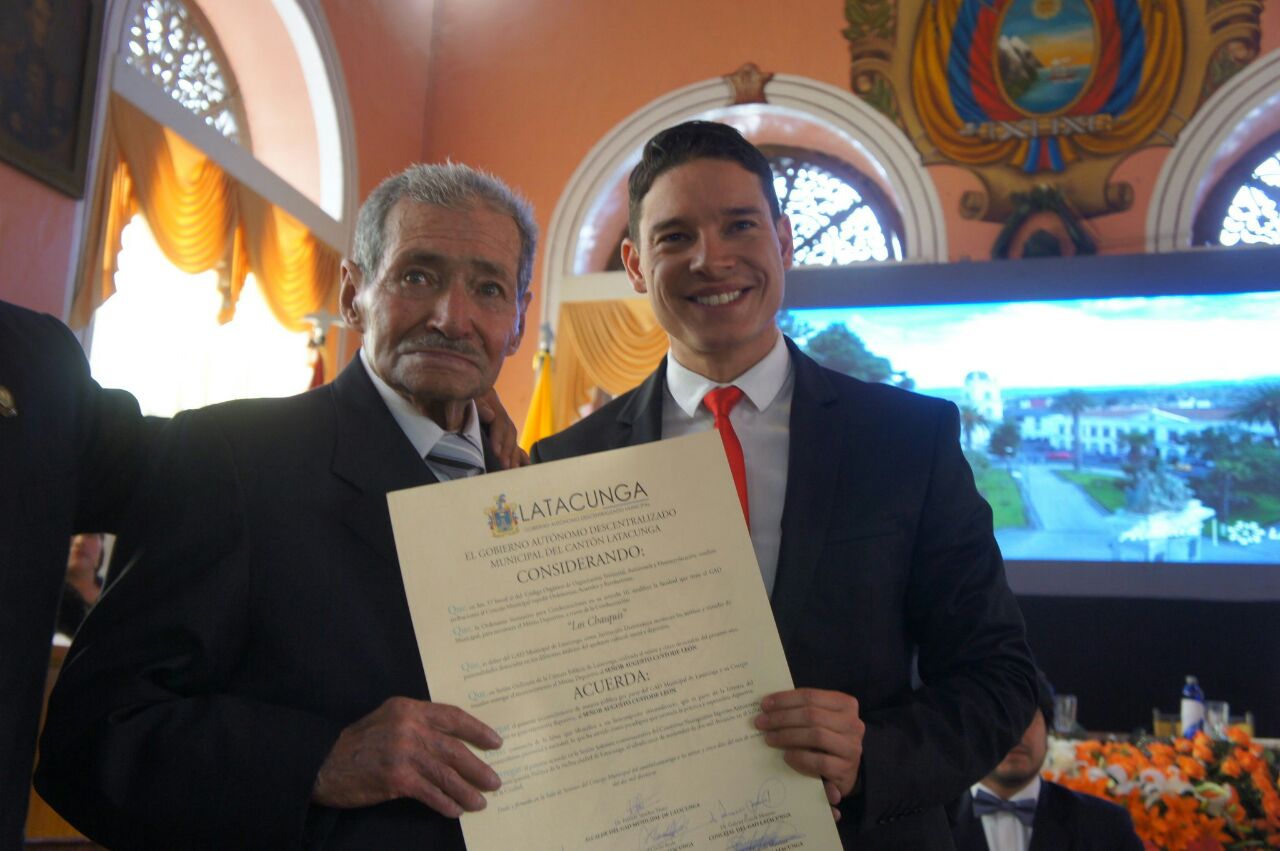 Durante la Sesión Solemne desarrollada en el Salón de Honor de la Ciudad, las autoridades presentes hicieron reconocimientos a latacungueños destacados y que han aportado al fortalecimiento de la identidad del cantón. El ministro Espinel, entregó la Condecoración al Mérito Deportivo «Los Chasquis» a uno de los mejores pilotos del país, al cotopaxense Augusto Custode León.